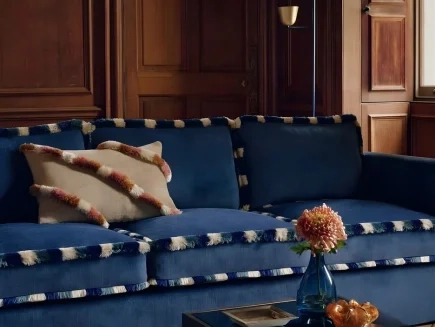 This living space is anchored by a blue upholstered sofa that brings depth and character to the room. Paired with refined finishes, subtle textures, and balanced proportions, the design achieves a sophisticated atmosphere.
