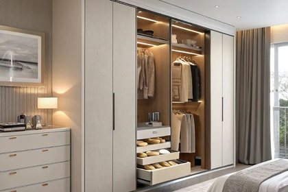 This walk-in closet features bespoke cabinetry, engineered wood finishes, and integrated lighting to create an organized, elegant storage space. Thoughtful layouts, soft textures, and premium materials ensure both functionality and visual sophistication.