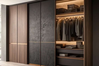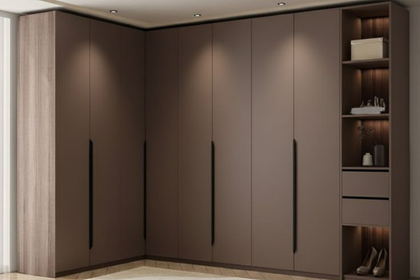 Designed with custom shelving, glass-front units, and refined wood finishes, this wardrobe closet balances style and usability. Integrated lighting and precision joinery enhance visibility, organization, and everyday convenience.